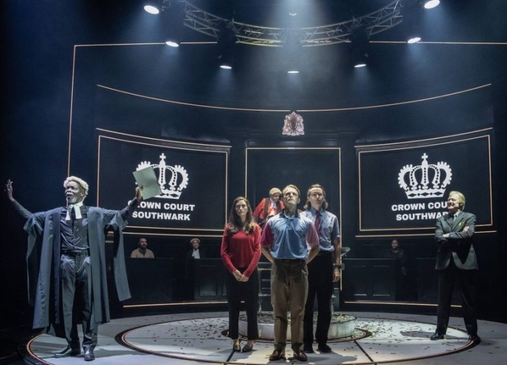 Rather than showcase the events chronologically, Quiz began at the end of story – with the trial of Charles (Lewis Reeves), his wife Diana (Charley Webb), and their supposed accomplice Tecwen Whittock (Marc Antolin). Act One followed the Prosecution’s case against the trio. As the evidence was presented, the witnesses recreated past events on stage (rather than simply telling us what happened). This all culminated in Ingram’s appearance on Millionaire.
